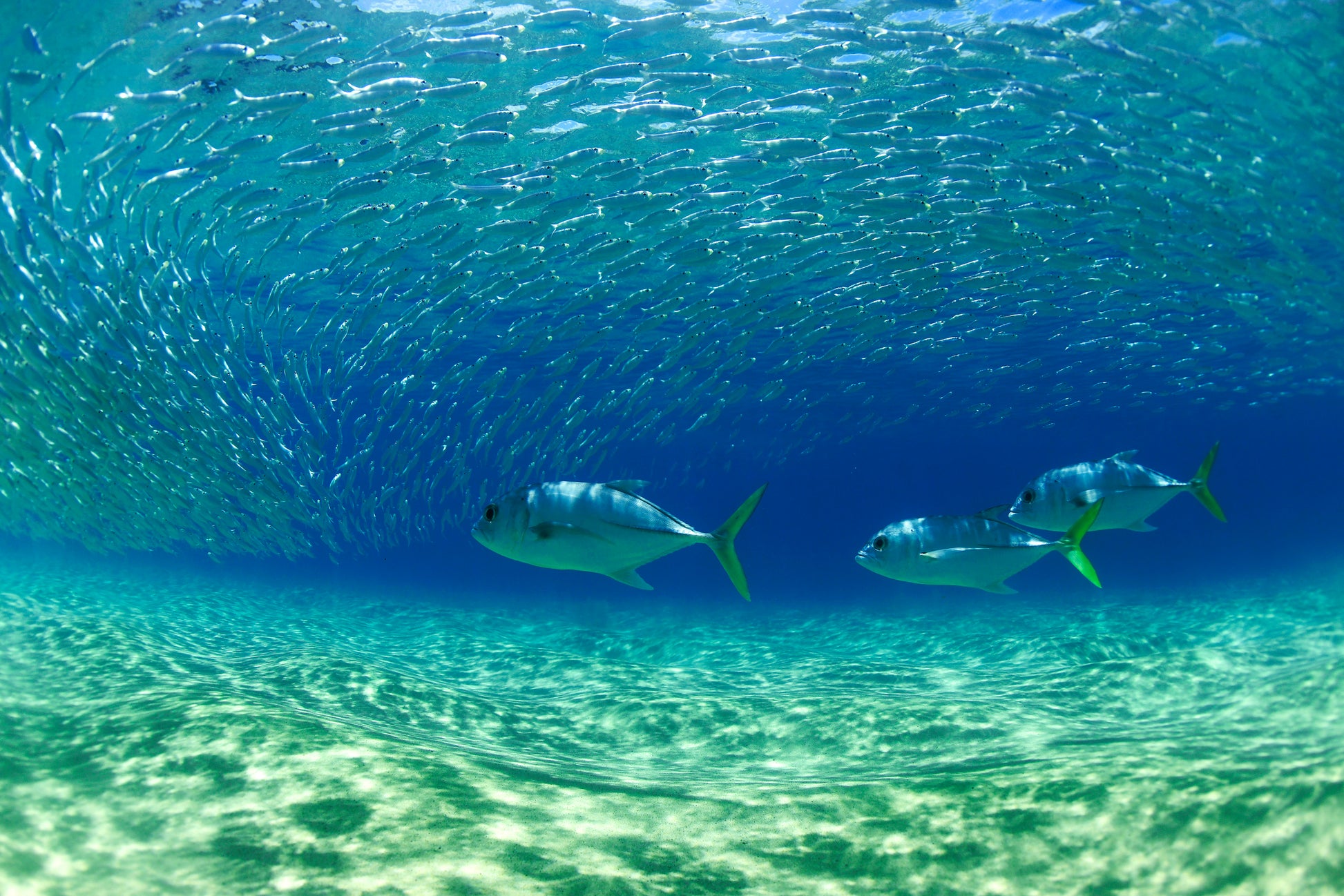 Uma das minhas cenas favoritas em Noronha. Os grandes cardumes de sardinha fugindo dos xaréus. Isso tudo acontece com no máximo um com metro de profundidade e sempre que a água está muito clara, eu passo horas fotografando.